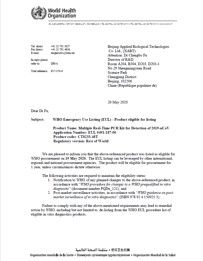 北京卓誠惠生生物科技股份有限公司新型冠狀病毒2019-nCoV核酸檢測試劑盒(熒光PCR法)于2020年5月19日正式被列入為世界衛(wèi)生組織(英文全稱“World Health Organization”,以下簡稱“WHO”)應(yīng)急使用清單(英文全稱“Emergency Use Listing”,以下簡稱“EUL”)。可供其他國家和地區(qū)采購。有效期限:如無特殊情況,該產(chǎn)品的采購期限為1年。